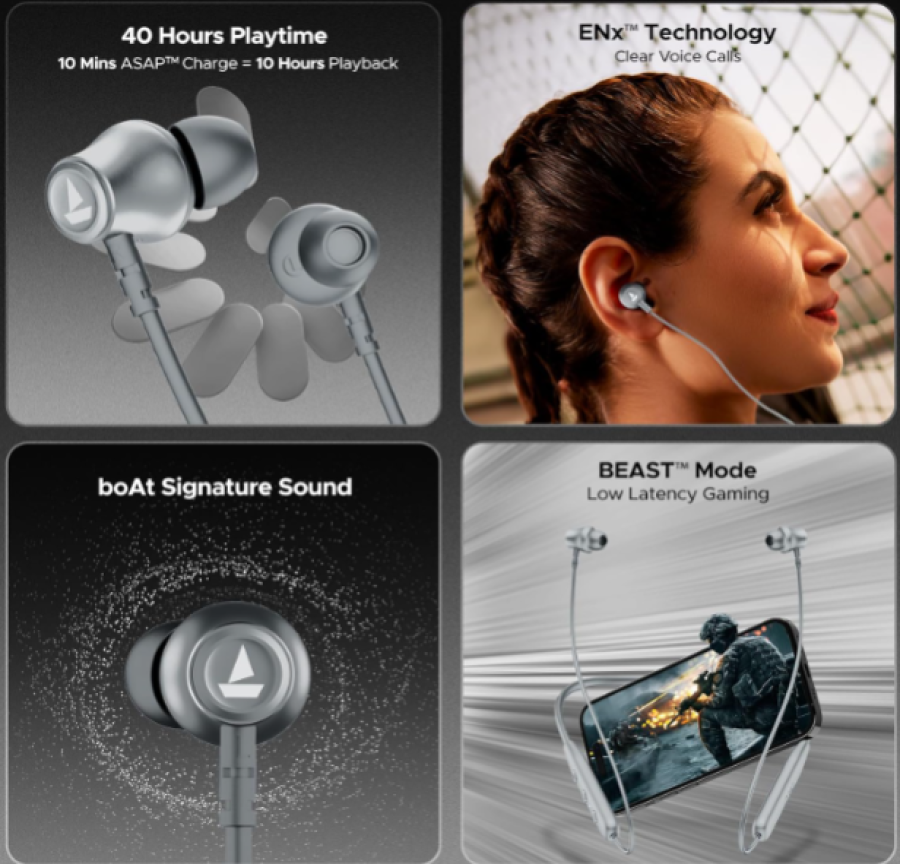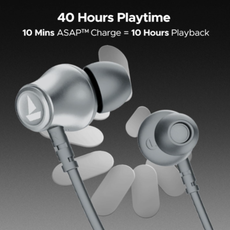 The boAt Rockerz 111 offers up to 40 hours of playtime, Dual Device Pairing, ENx Tech, and BEAST Mode. It features ASAP charging, Bluetooth 5.3, IPX5 rating, and magnetic in-ear buds.
