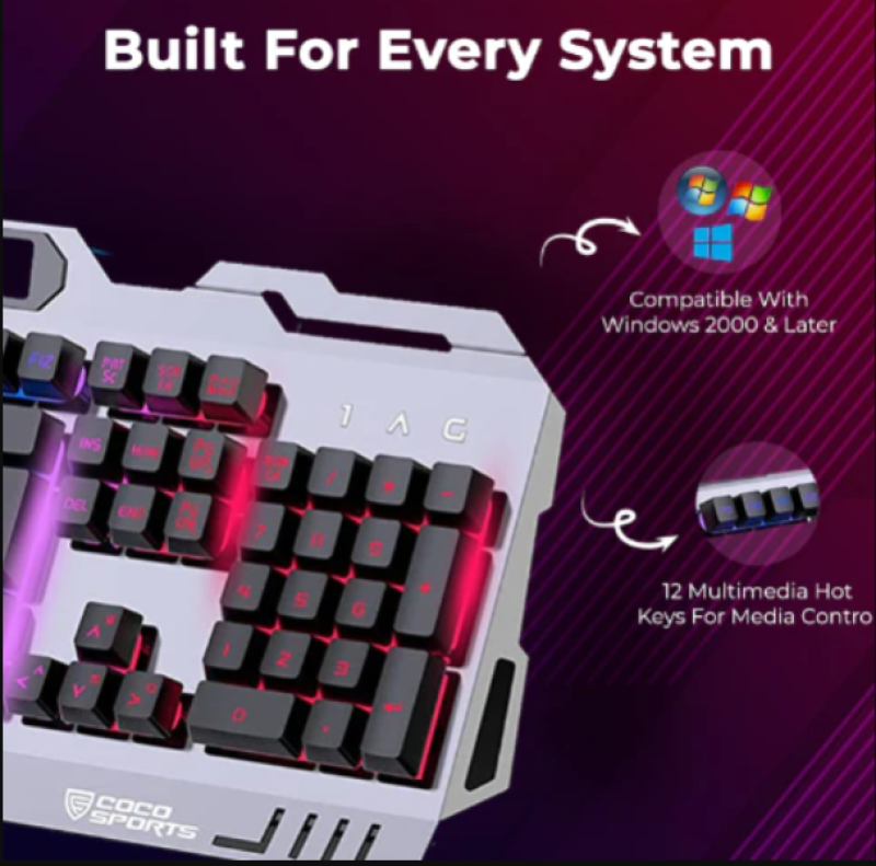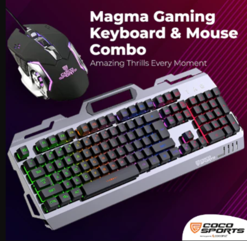 The COCO SPORTS MAGMA is a wired gaming keyboard and mouse combo designed for gamers, featuring responsive keys, customizable RGB lighting, and an ergonomic build for comfortable, extended play sessions.
