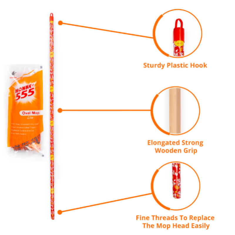 Super absorbent cotton threads Replaceable mop head Elongated strong wooden grip Sturdy plastic hook