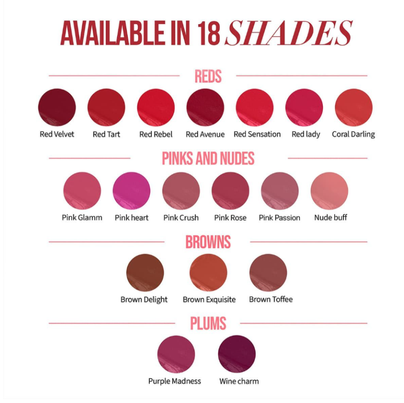 | Lipstick color : | Nude buff, Red Velvet, Wine Charm, Brown Delight, Pink Glamm, Pink Rose, Pink Crush, Brown Toffee, Pink Heart, Red Avenue, Red Tart, Brown Exquisite, Purple Madness, Pink Passion, Red Sensation, Red Lady, Coral Darling, Red Rebel |
