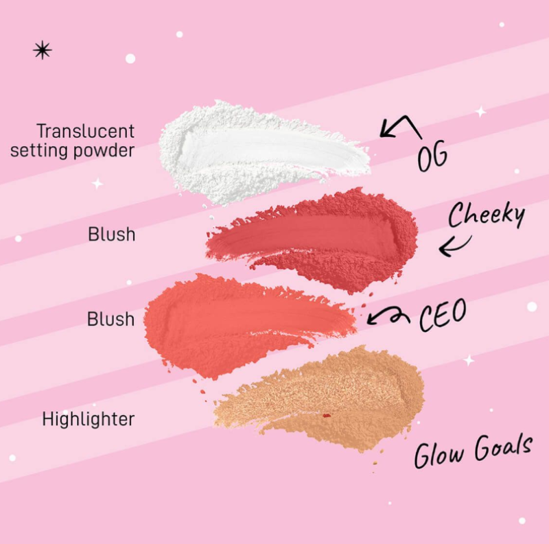 - All-in-One Kit: Includes 2 peachy-coral blush shades, a golden highlighter, and a translucent setting powder