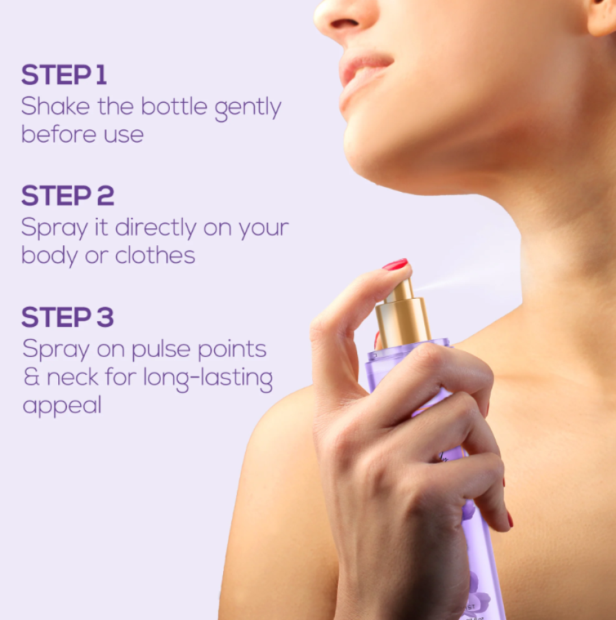 - Directions for Use: Shake the bottle gently before use. Spray directly on your body and clothes, focusing on pulse points and neck for long-lasting fragrance