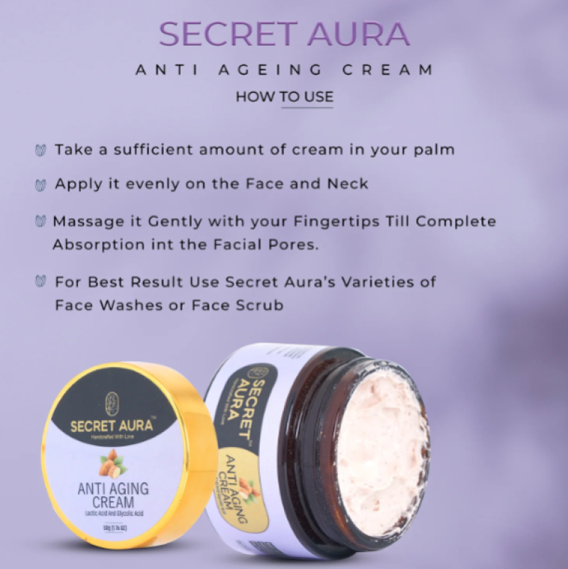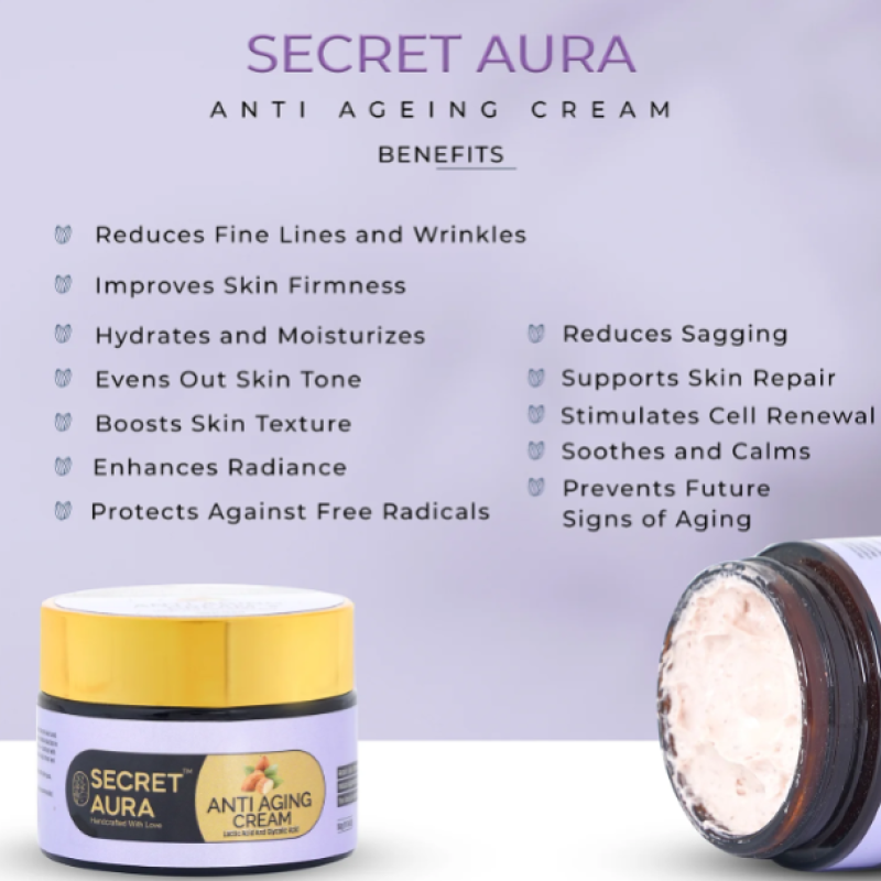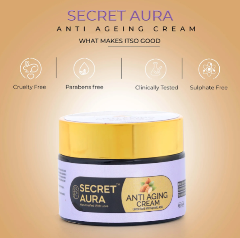 Secret Aura’s anti-aging cream gives a visible reduction in aging signs PA+++ |Enriched with Lactic Acid, Glycolic Acid, Retinol, and shea butter |Men and Women All skin types|50 Grams Pack