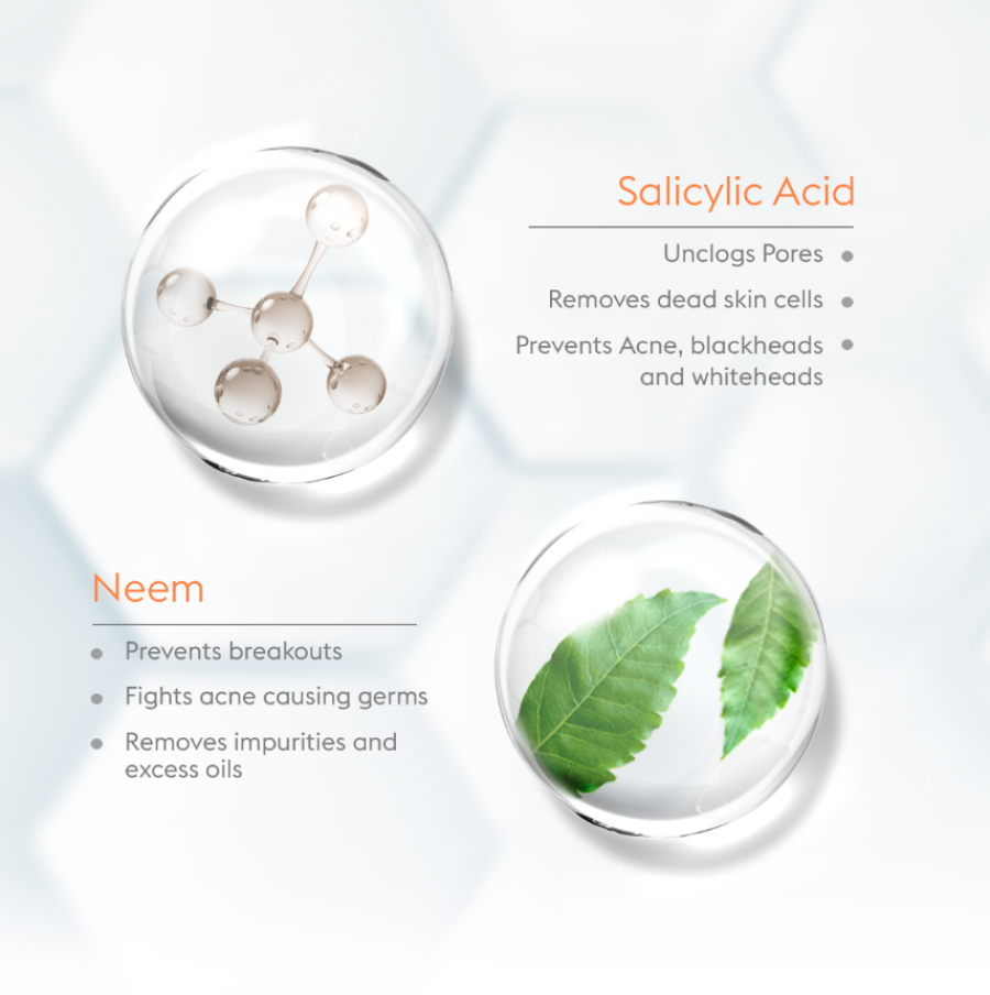 - Cleanses and purifies skin with salicylic acid and neem extracts.