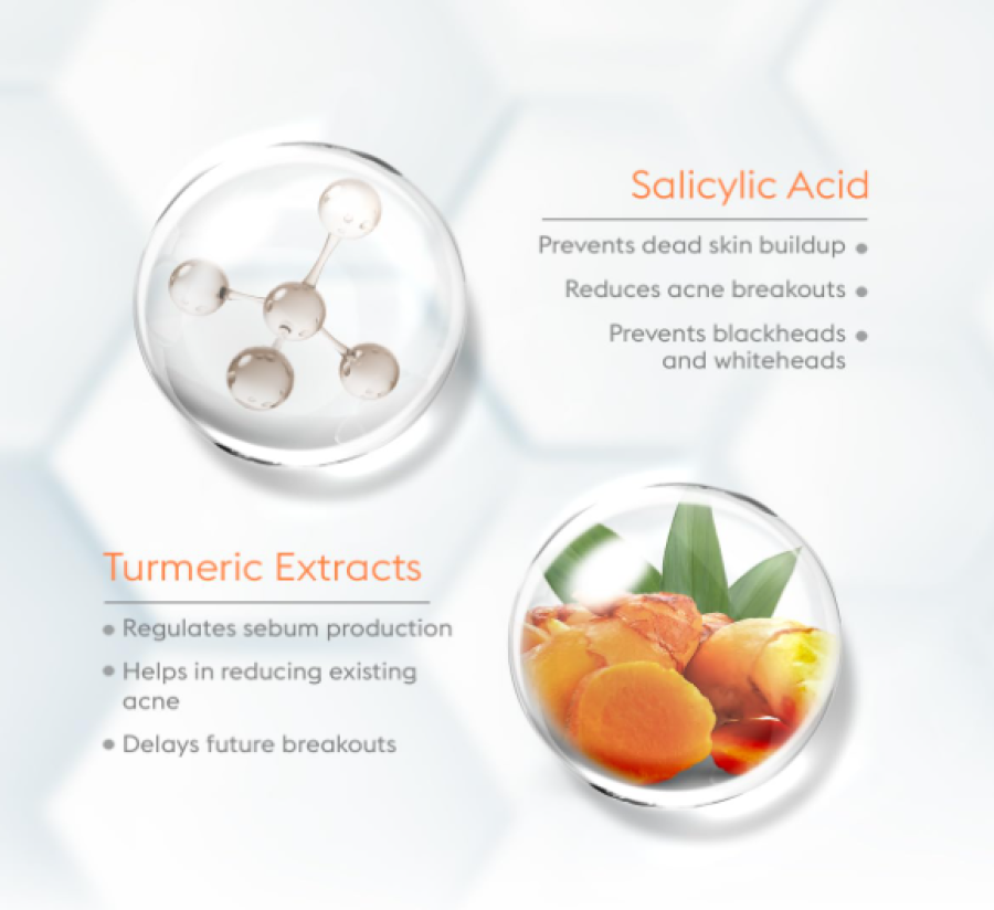 - Contains salicylic acid and turmeric to target acne and blemishes.